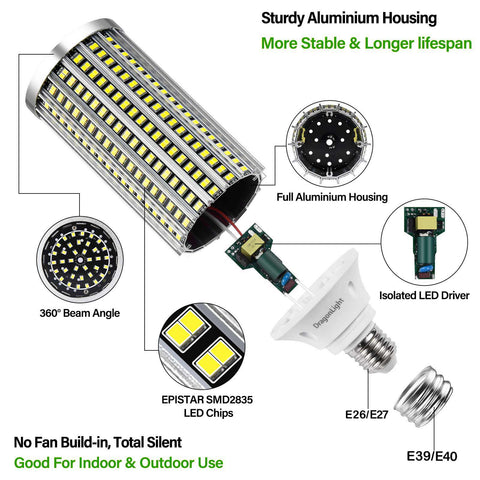 • E26 with E39 Adapter (Europe: E40 to E27 adapter), fit both screw-in regular medium and large mogul base fixtures, widely used at home, garage, basement, security, factory, supermarket, office, parking lot, church, exhibition hall, gym wherever need sufficient lighting